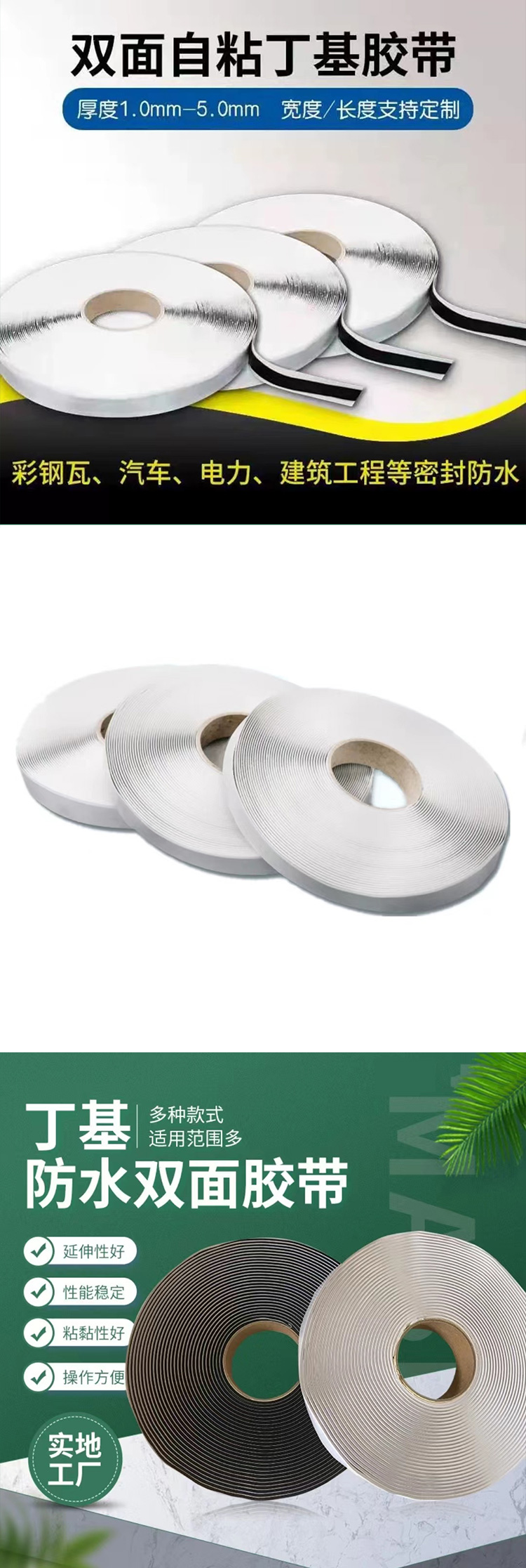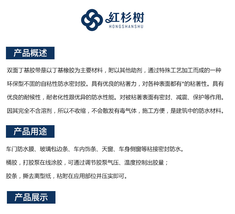 - 雙面丁基膠帶是以丁基橡膠為主要材料,附以其他助劑,通過特殊工藝加工而成的一種環(huán)保型不固的自粘性防水密封膠。具有優(yōu)良的粘著力,對(duì)各種表面都有*的粘著性。具有優(yōu)良的耐候性,耐老化性跟優(yōu)異的防水性能。對(duì)被粘著表面有密封、減震、保護(hù)等作用。因其完全不含溶劑,所以不收縮,不會(huì)散發(fā)有毒氣體,施工方便,是建筑中的防水材料。